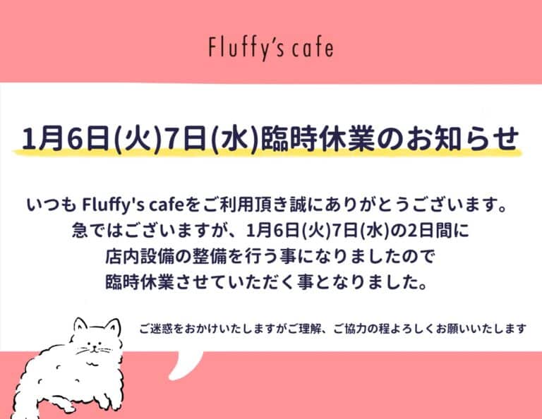 いつも Fluffy’s cafeをご利用頂き誠にありがとうございます✨ 急ではございますが、1月6日(火)7日(水)の2日間に店内設備の整備を行う事になりましたので臨時休業させていただく事となりました🔧
